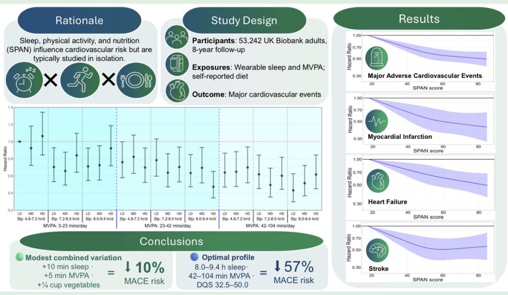 Researchers followed more than 53,000 adults and looked at three things together: sleep, moderate-to-vigorous physical activity, and diet quality. Over about 8 years, people with better combined habits had lower risk of major cardiovascular events like heart attack, stroke, and heart failu