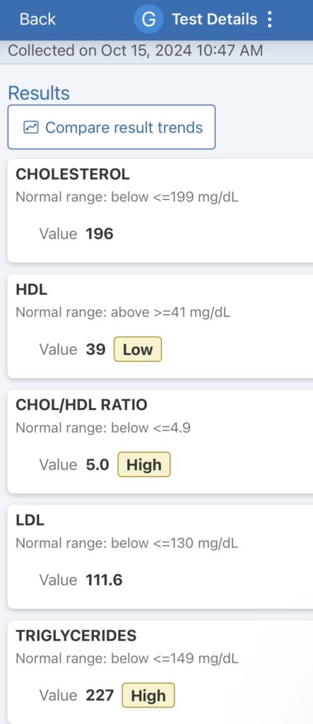 My bloodwork was okay-ish: A1C 5.4 and lipids slightly high (unsurprisingly):