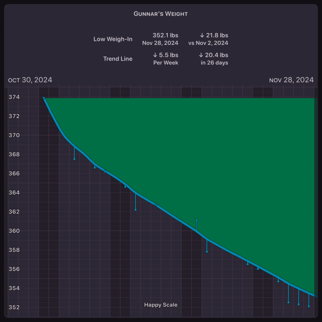 Anyway, I saw the PCP (actually a Nurse Practitioner who turned out to be great) and I was in for a shock. I knew I had gained weight, but I had avoided weighing myself (stupid again!). At the doctor’s office, I was shocked when I saw the weight on the scale: 373 lbs! For reference, I am 6’4” and 52 years old. This is a BMI of 45 and really gave me a jolt. Before the visit, I had already thought about asking about a GLP-1 agonist, and luckily, the PCP brought up Zepbound, which I enthusiastically agreed to. We also found that my blood pressure was high (126/90 after measuring it 3 times), which was not surprising but a little scary as my mom had hypertension most of her life.