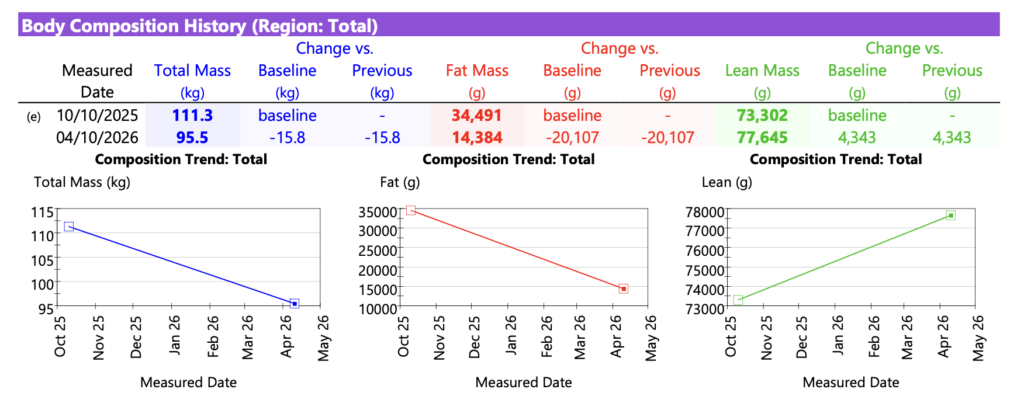 The other thing I liked about the DEXA is that it helped answer the question a lot of people have during aggressive weight loss especially on GLP-1RAs: am I losing too much lean tissue along the way? In my case, total fat mass dropped from 76 lbs to 32 lbs, while lean mass went from 162 lbs to 171 lbs. So the headline wasn’t just that I got lighter. It was that I appear to have lost 44 lbs of fat while gaining 9 lbs of lean mass!