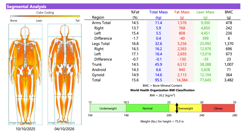 What made the DEXA valuable for me wasn’t just body fat percentage. The main numbers I cared about, in order, were: