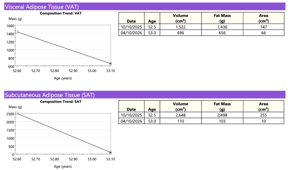 Context: I’m a 53-year-old male, 6’3”, prescribed Zepbound 12.5 mg/week and TRT 120 mg/week. My starting weight in October 2024 was 373 lbs when I got on Tirzepatide (Zepbound GLP-1) and started losing weight. By my first DEXA in October 2025, I was down to 245 lbs, and by my second in April 2026, I was 210 lbs.