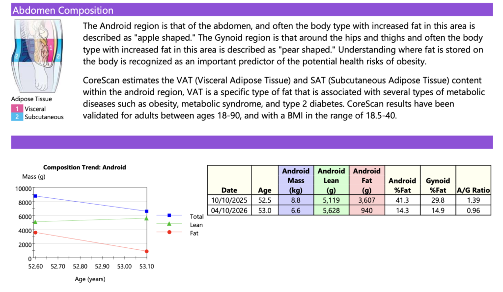 Second was android/gynoid ratio. I was aiming for under 1.0, and mine went from 1.39 to 0.96. To me, that says a lot more than body weight alone, because I care much more about central fat distribution than the scale.